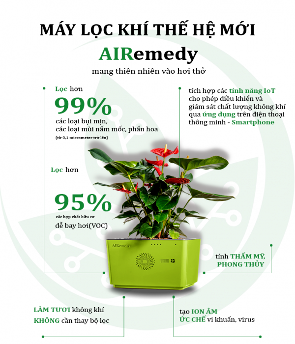 Máy lọc không khí AIRemedy sử dụng bộ lọc sinh học theo công nghệ Ebio. Máy giúp lọc sạch hơn 99% bụi mịn và 95% các tác nhân ô nhiễm.